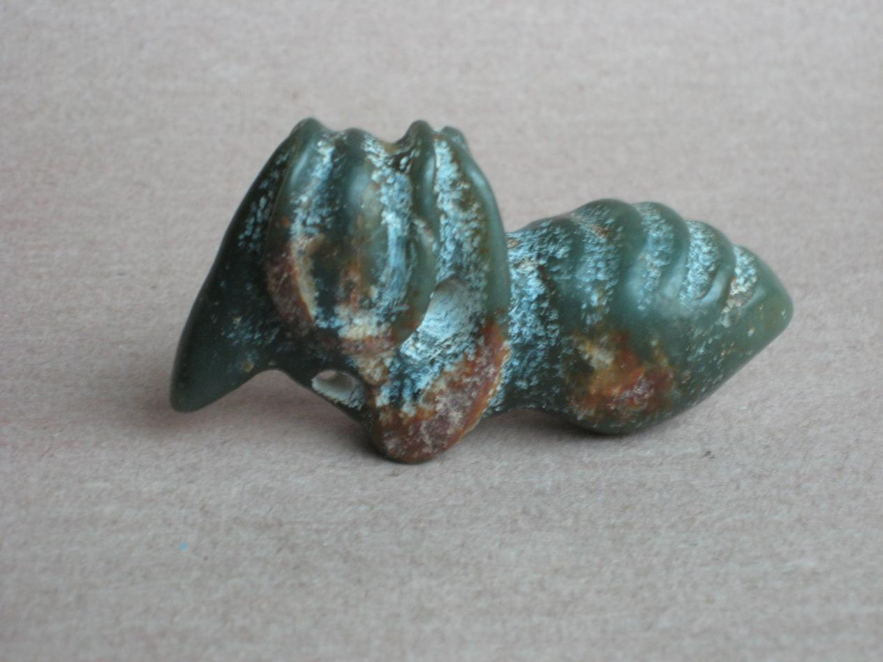 评价:造型诡异,想象离奇,玉质坚细,沁色无比。